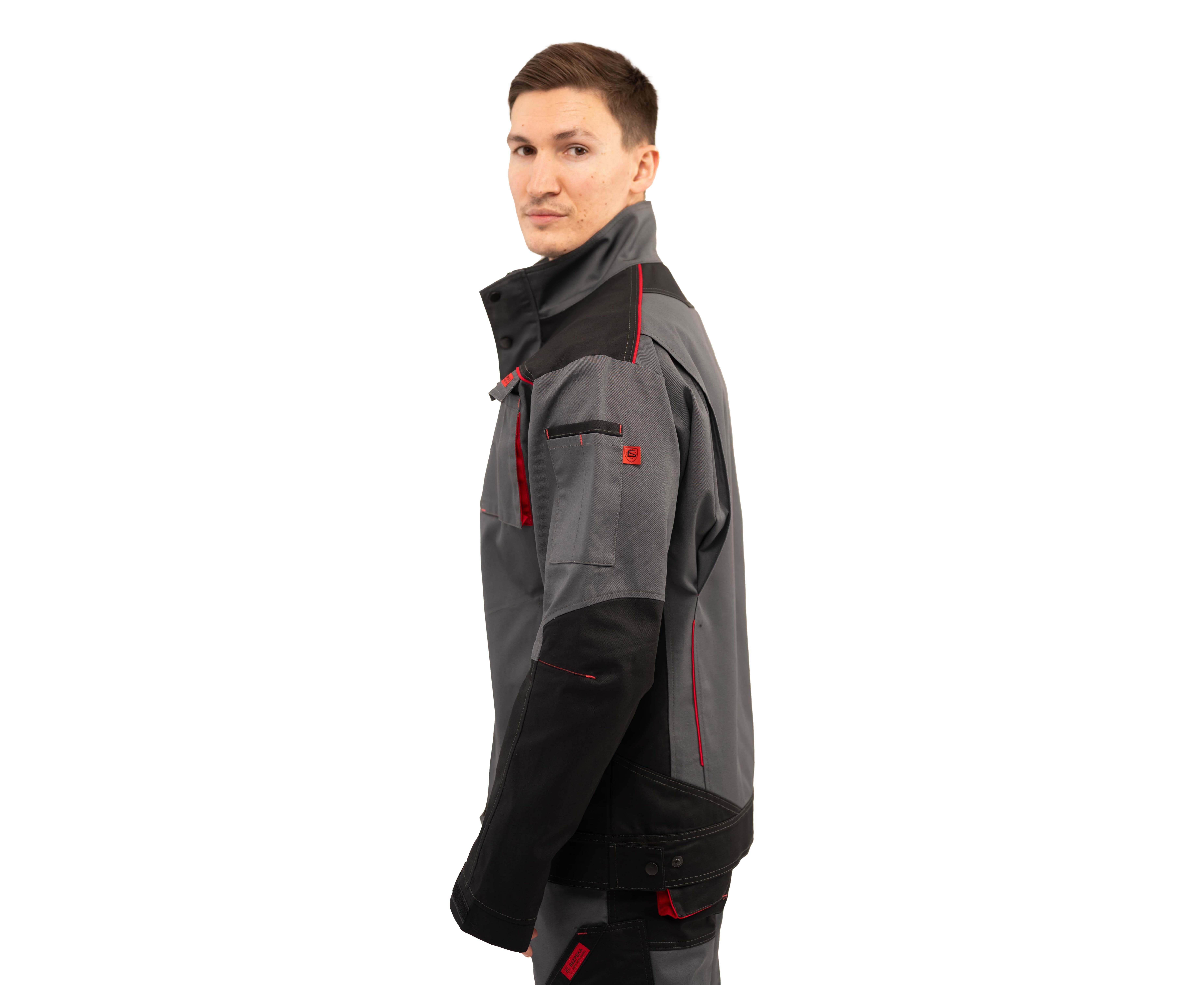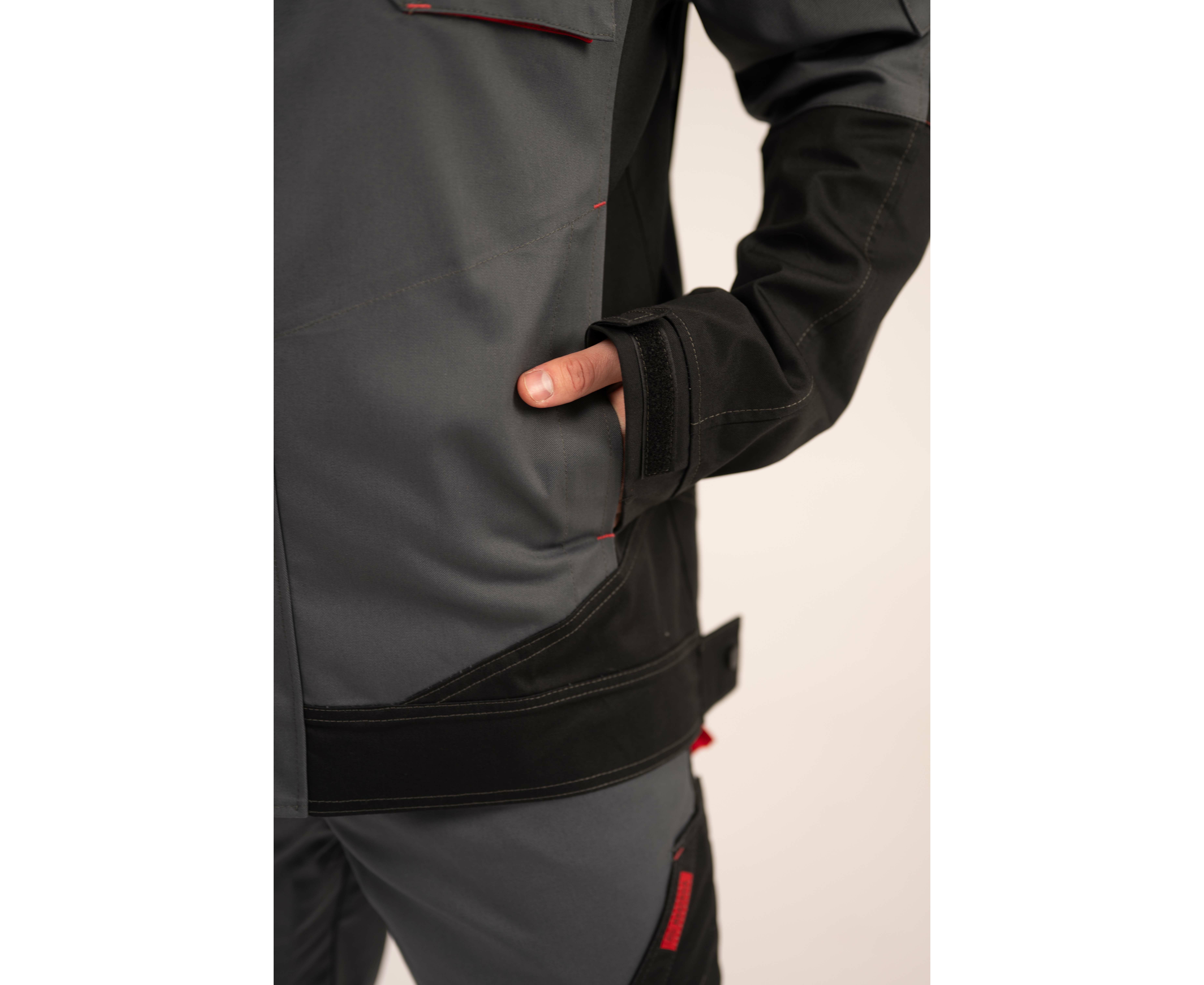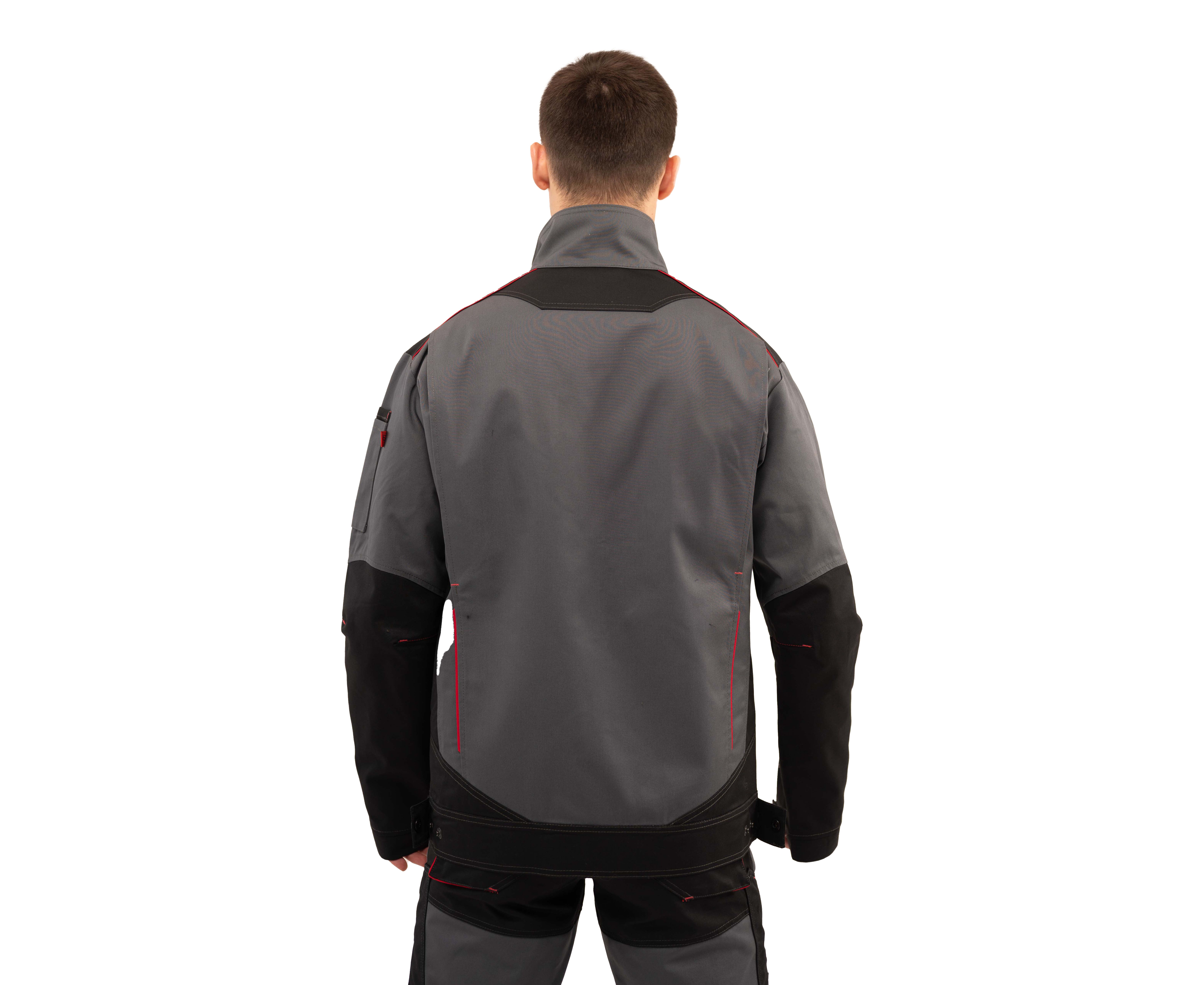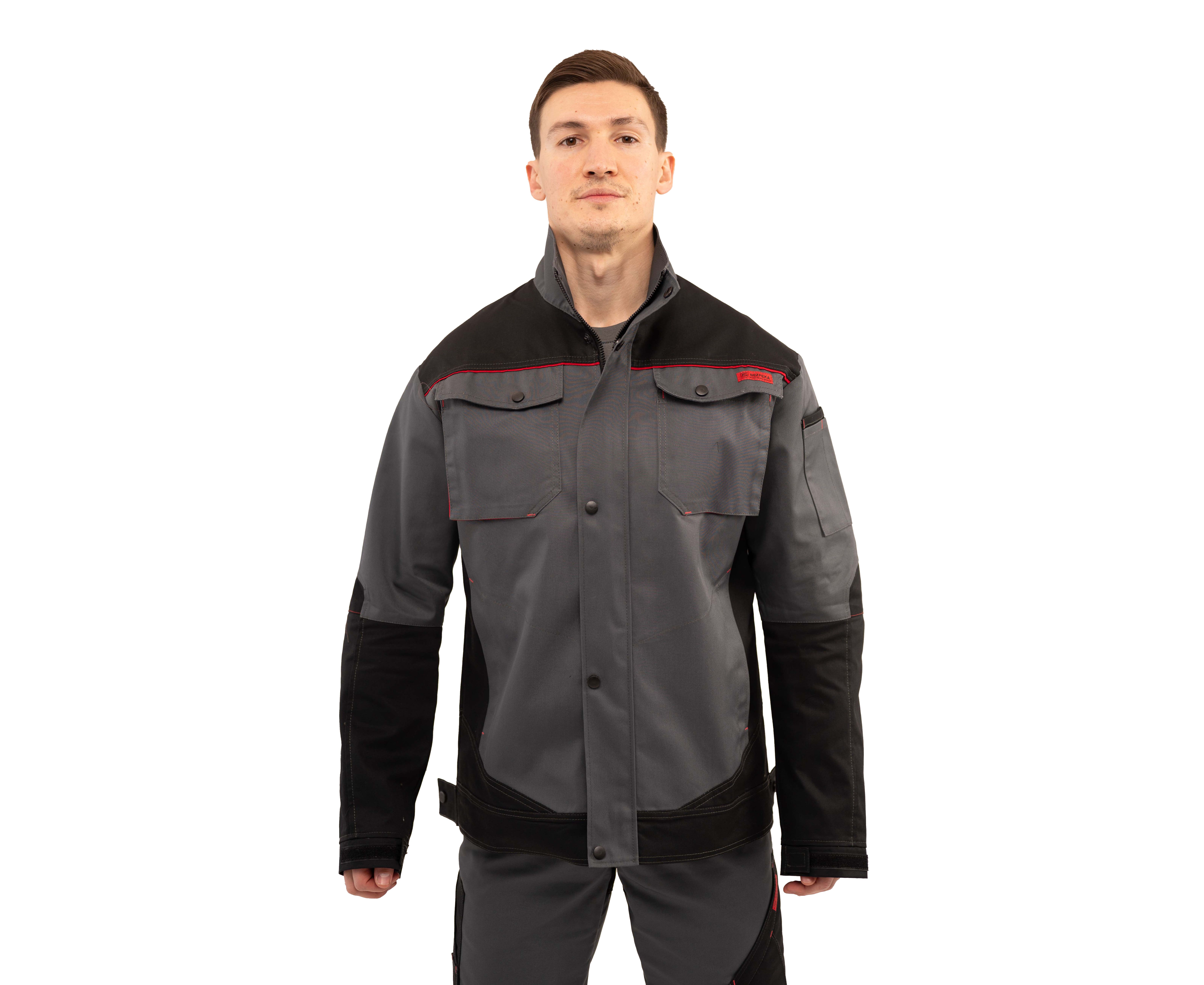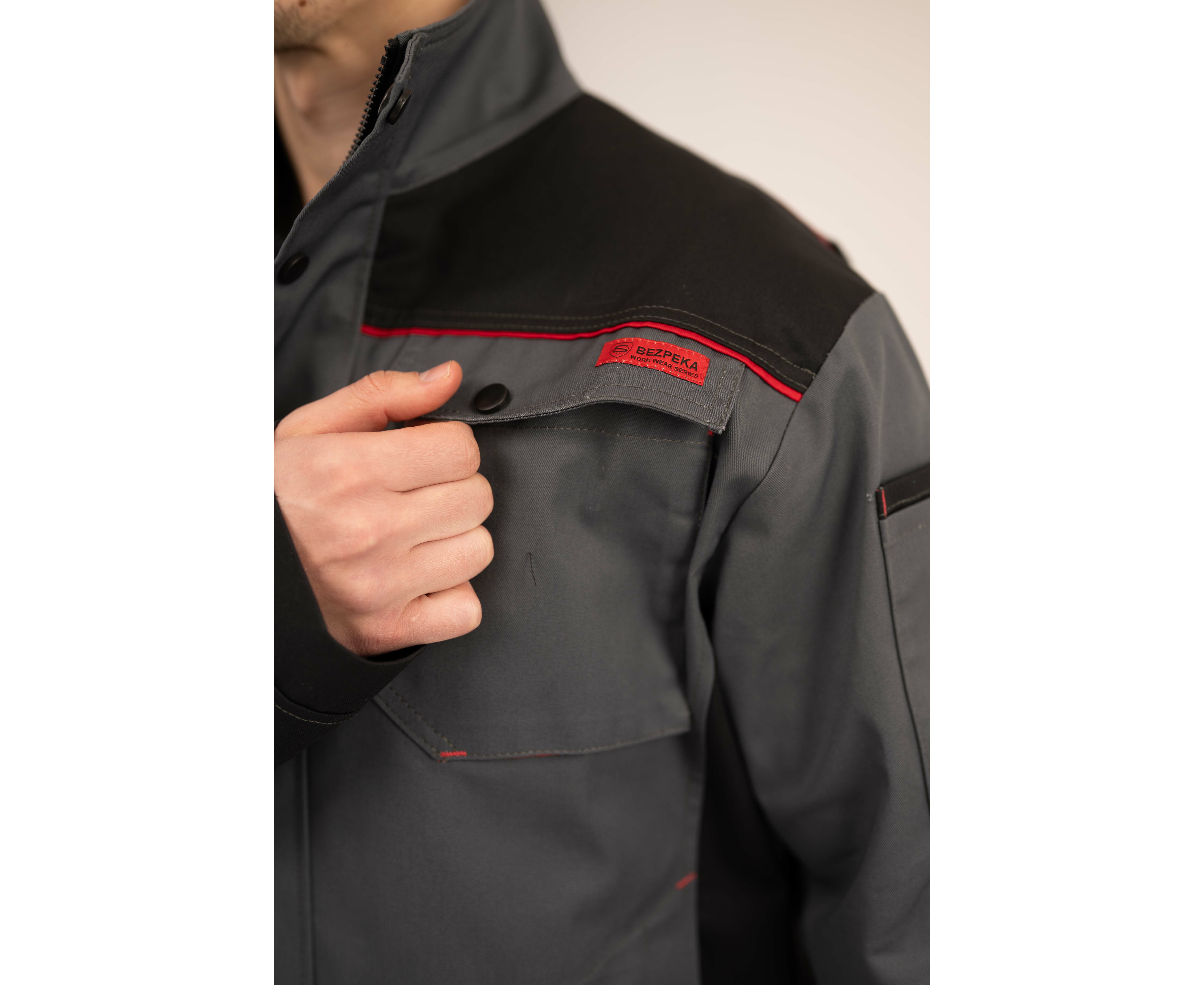 Куртка чоловіча робоча Premium new 2 Grey прямого силуету з комбінованої саржі з оздобленням у чорно-червоній кольоровій гамі з центральною застібкою на тасьму «блискавка», яка закривається захисною планкою на кнопках.