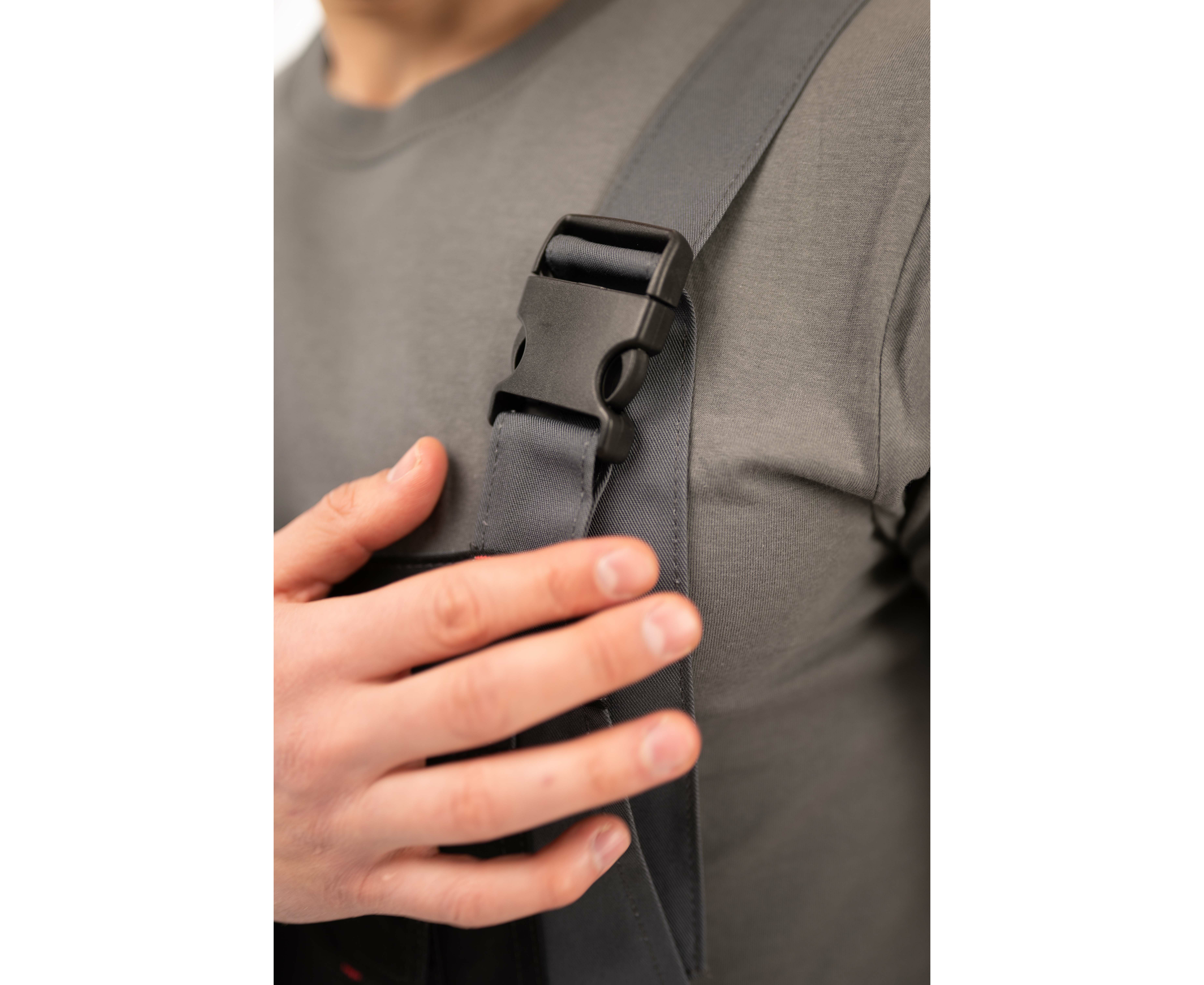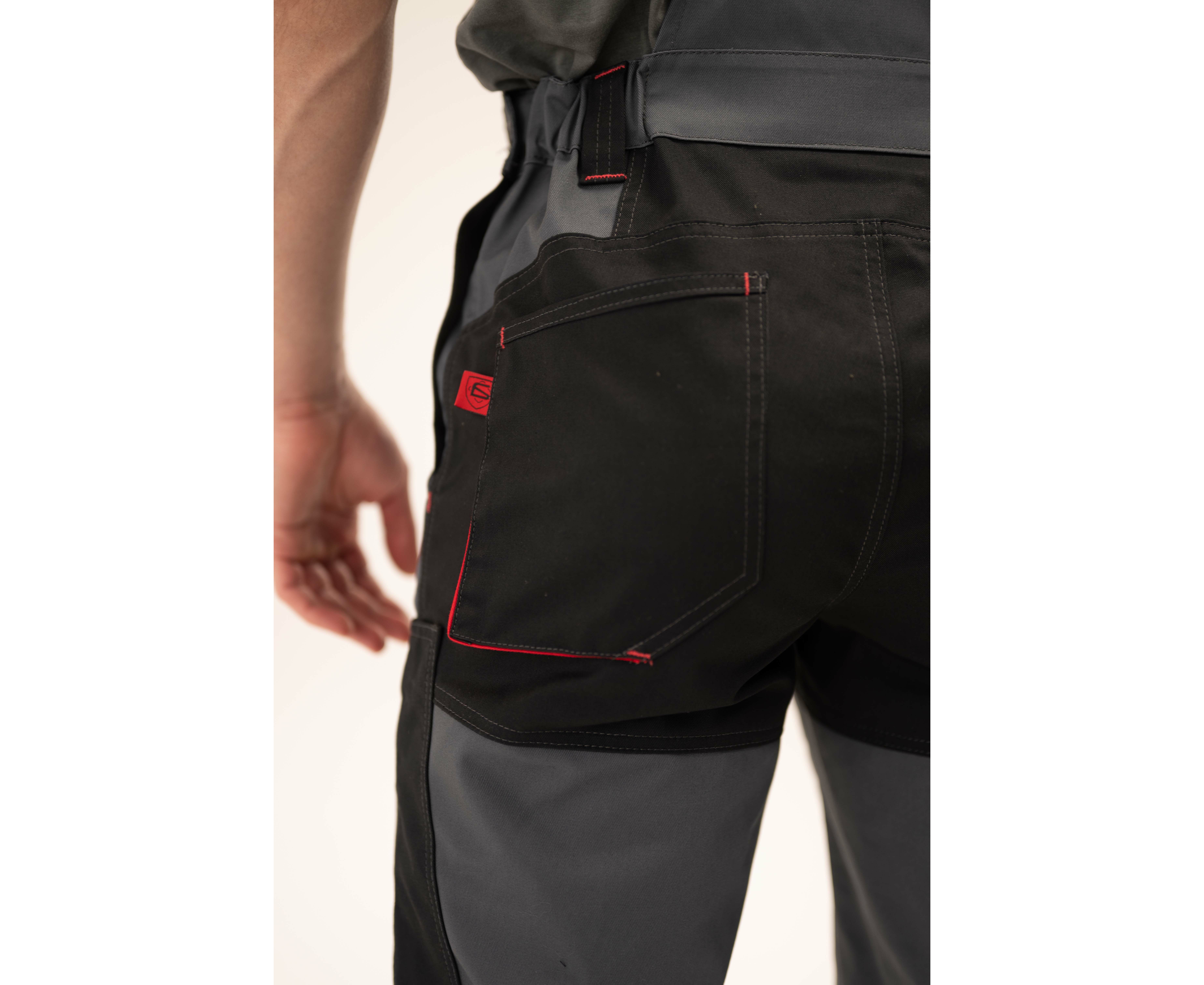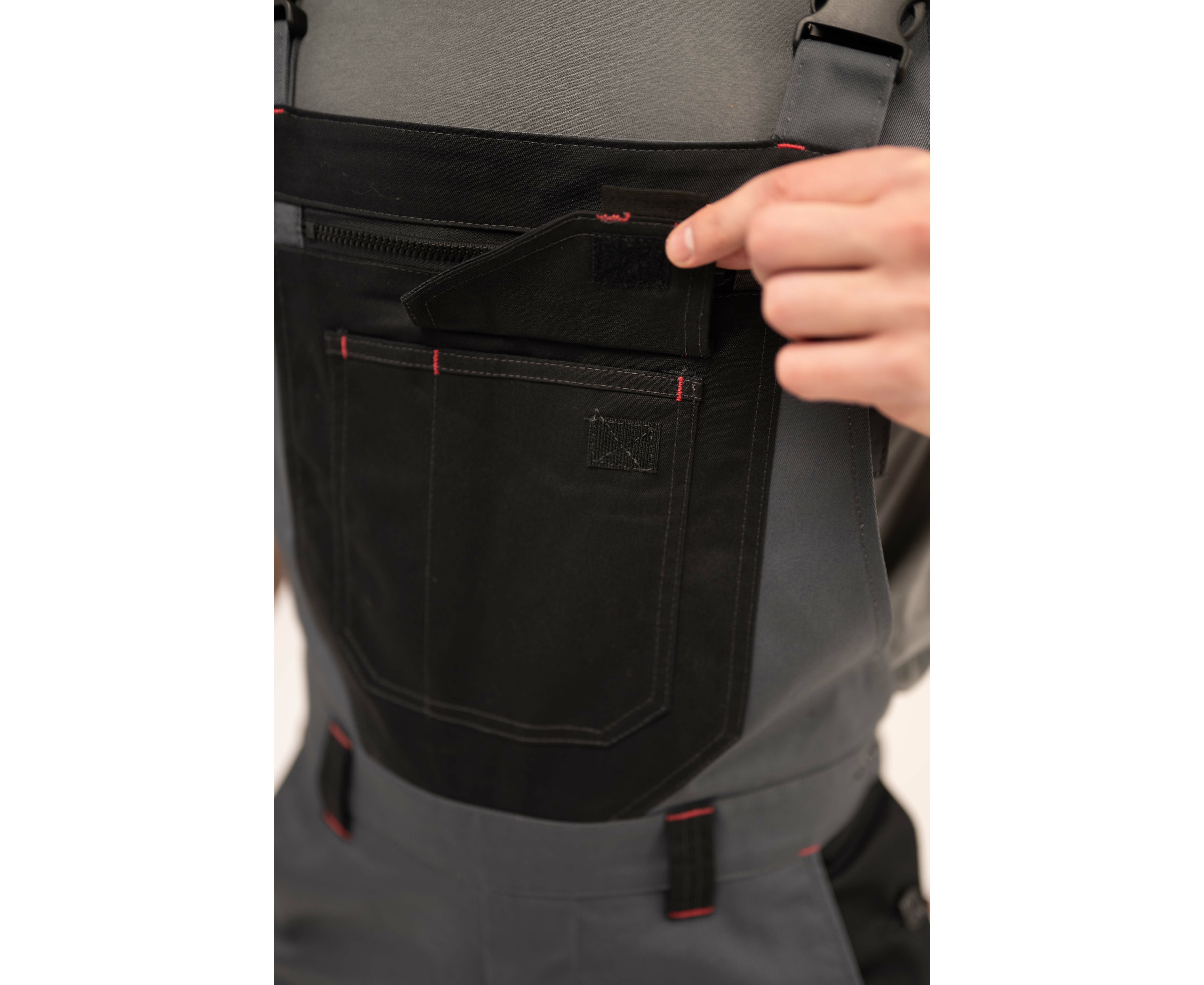 На напівкомбінезоні розташовано 8 кишень: 1 – нагрудна на блискавці, 2 – з клапанами на застібці «липучка». Пояс притачний з чотирма шльовками. З боків заднього пояса вшита еластична тасьма для регулювання по талії. Низ напівкомбінезону посилений манжетами із тканини Cordura.