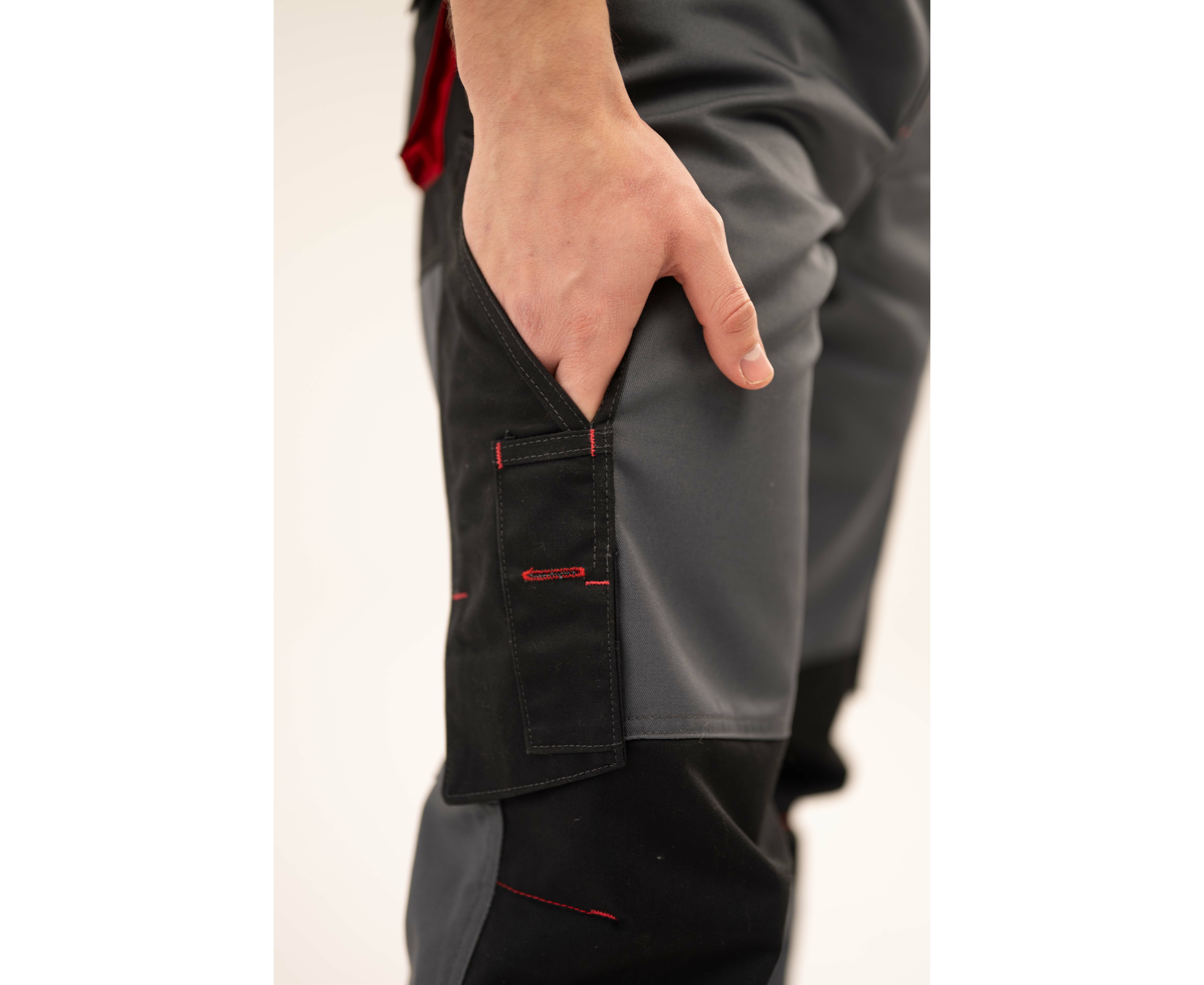 Напівкомбінезон чоловічий із комбінованої саржі з оздобленням у чорно-червоній кольоровій гамі, з високим нагрудником та бічними застібками на гудзики. Бретели з еластичною тасьмою на карабінах, гульфік на блискавці.