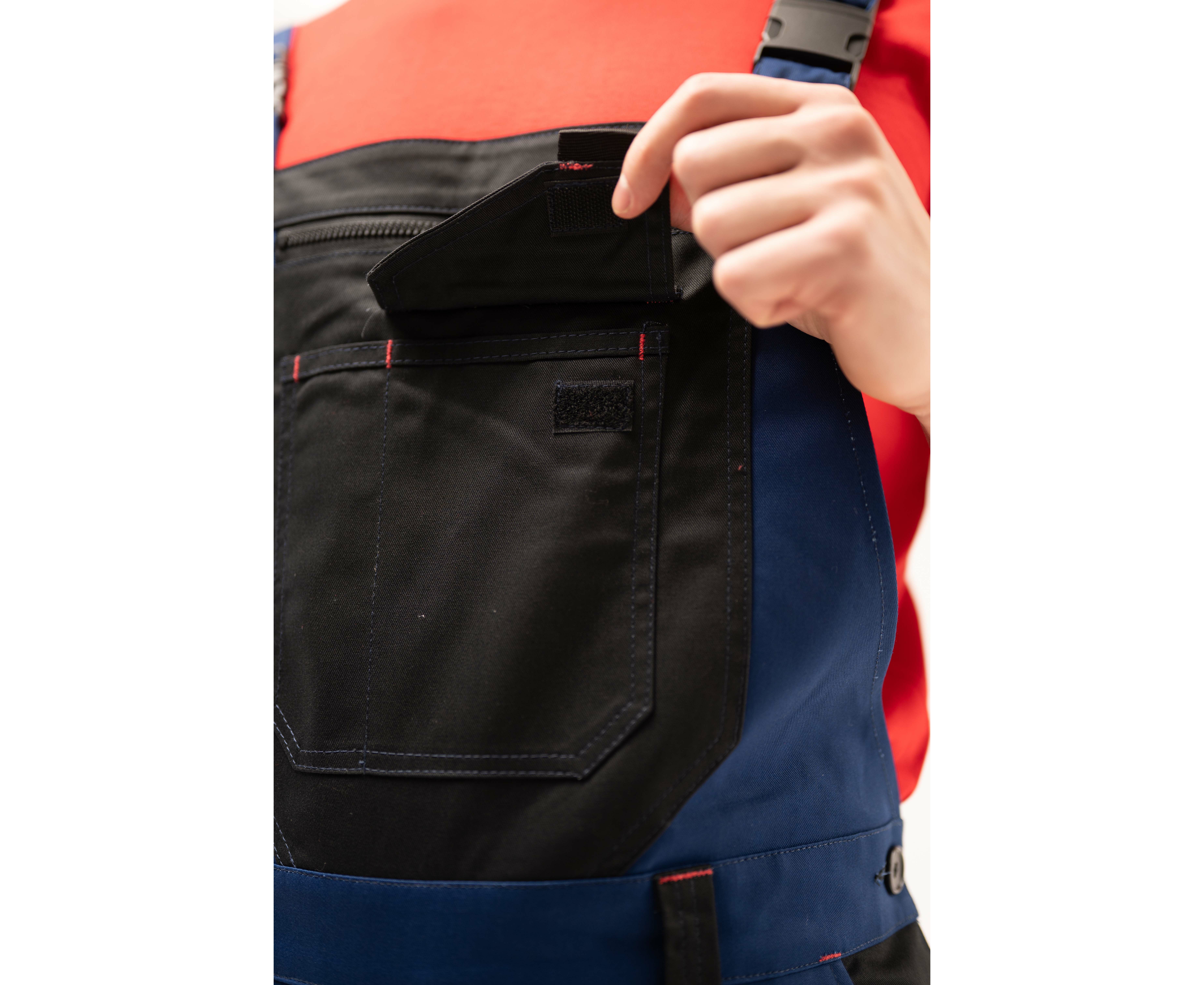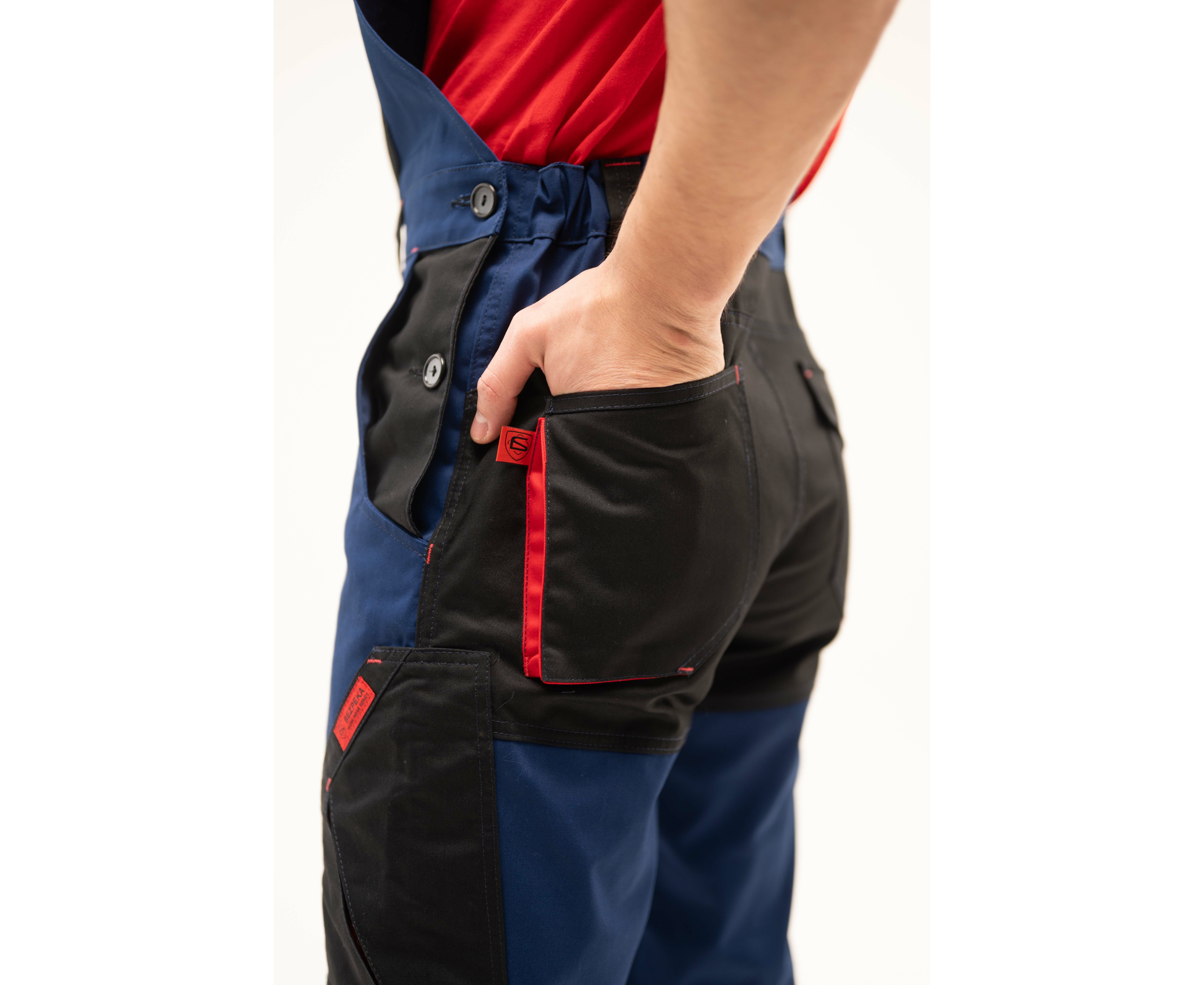 На напівкомбінезоні розташовано 8 кишень: 1 – нагрудна на блискавці, 2 – з клапанами на застібці «липучка». Пояс притачний з чотирма шльовками. З боків заднього пояса вшита еластична тасьма для регулювання по талії. Низ напівкомбінезону посилений манжетами із тканини Cordura.
