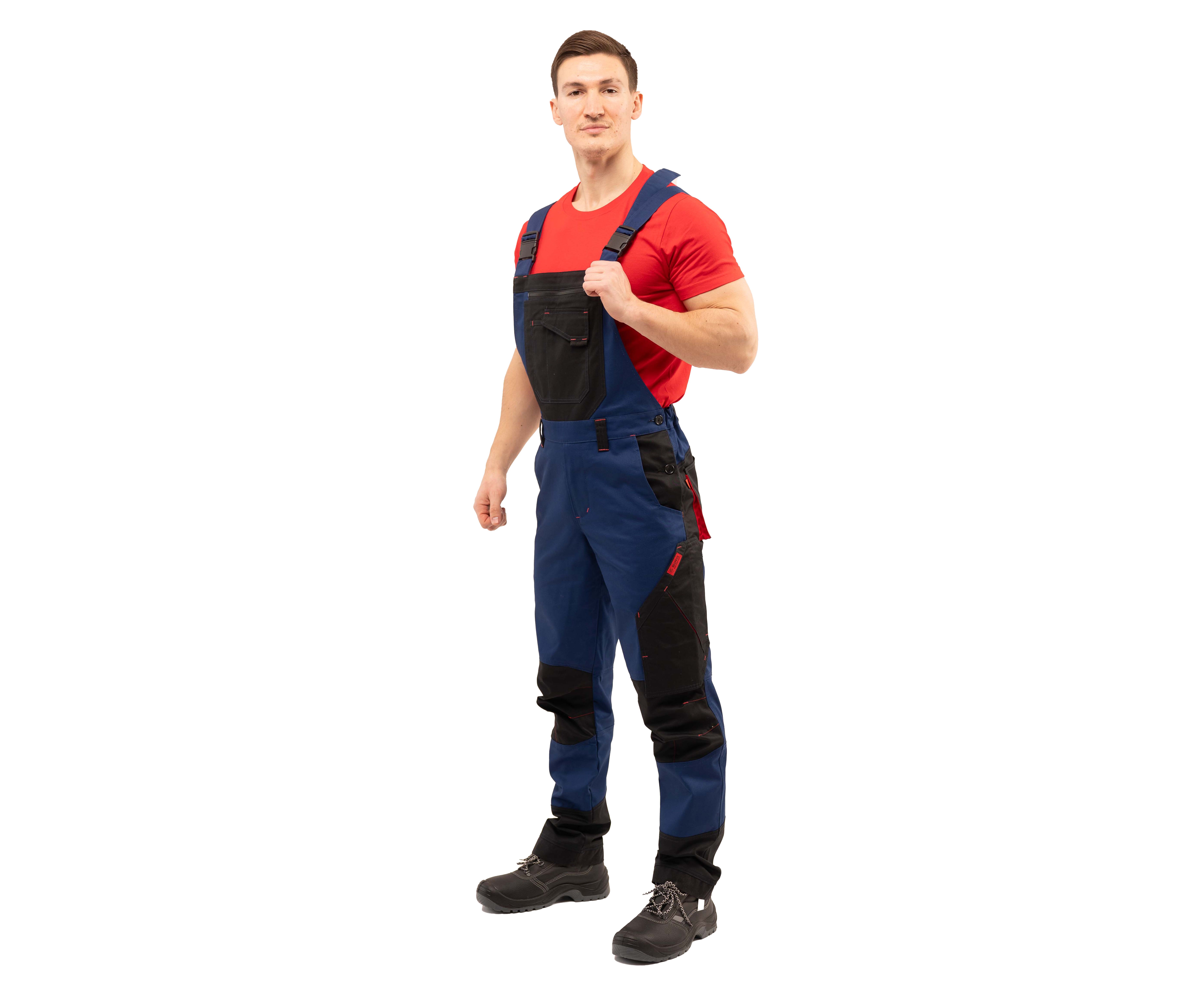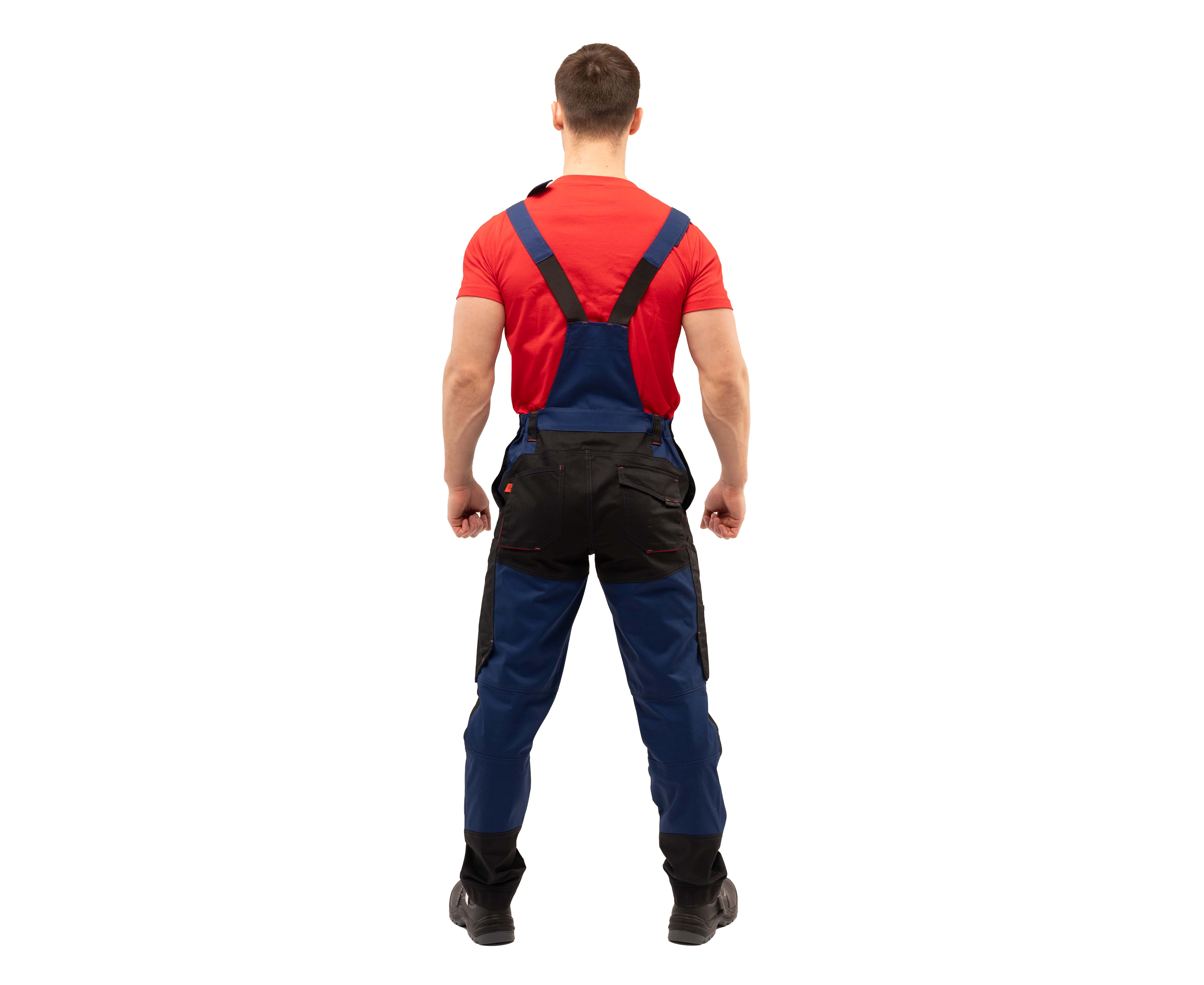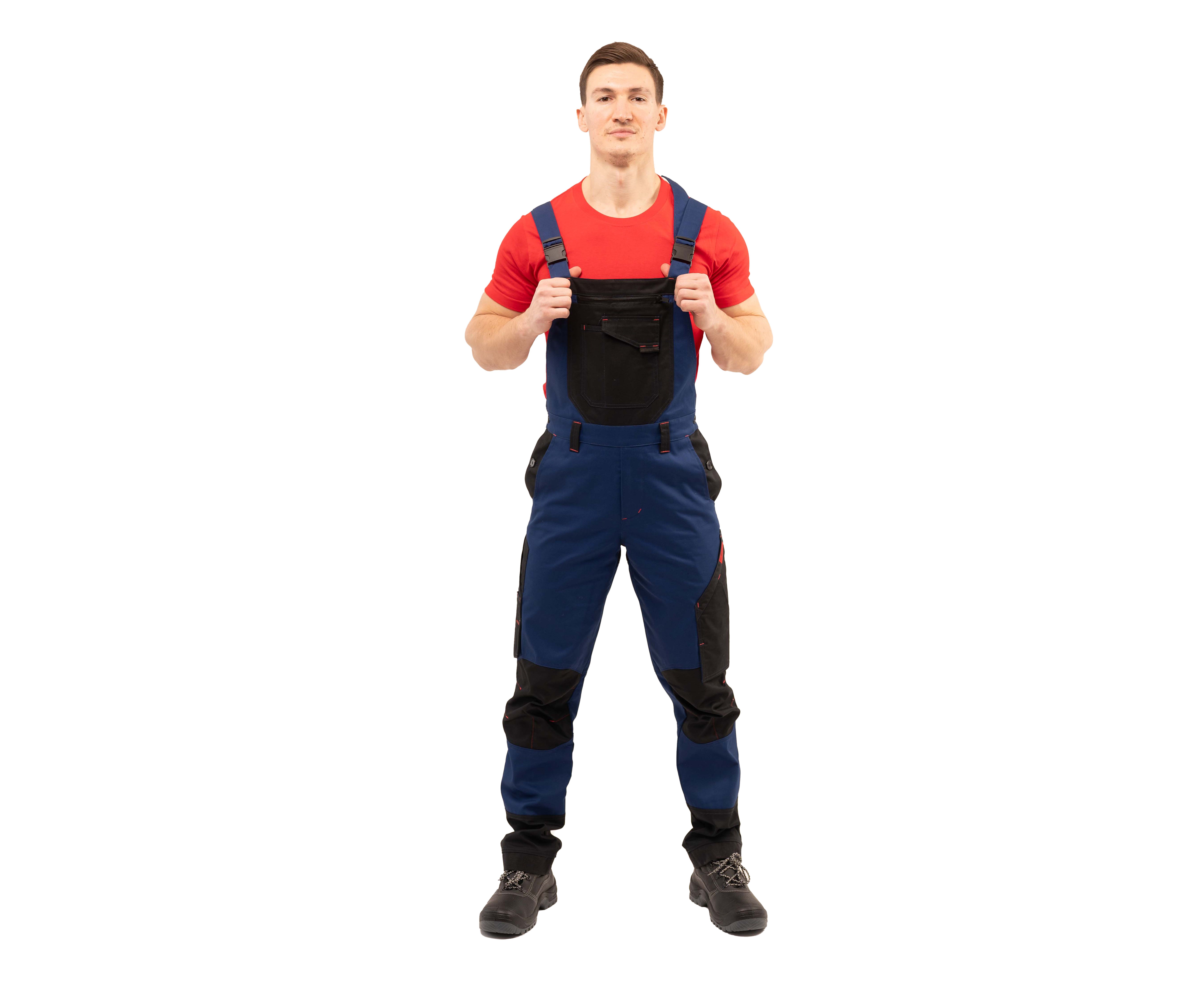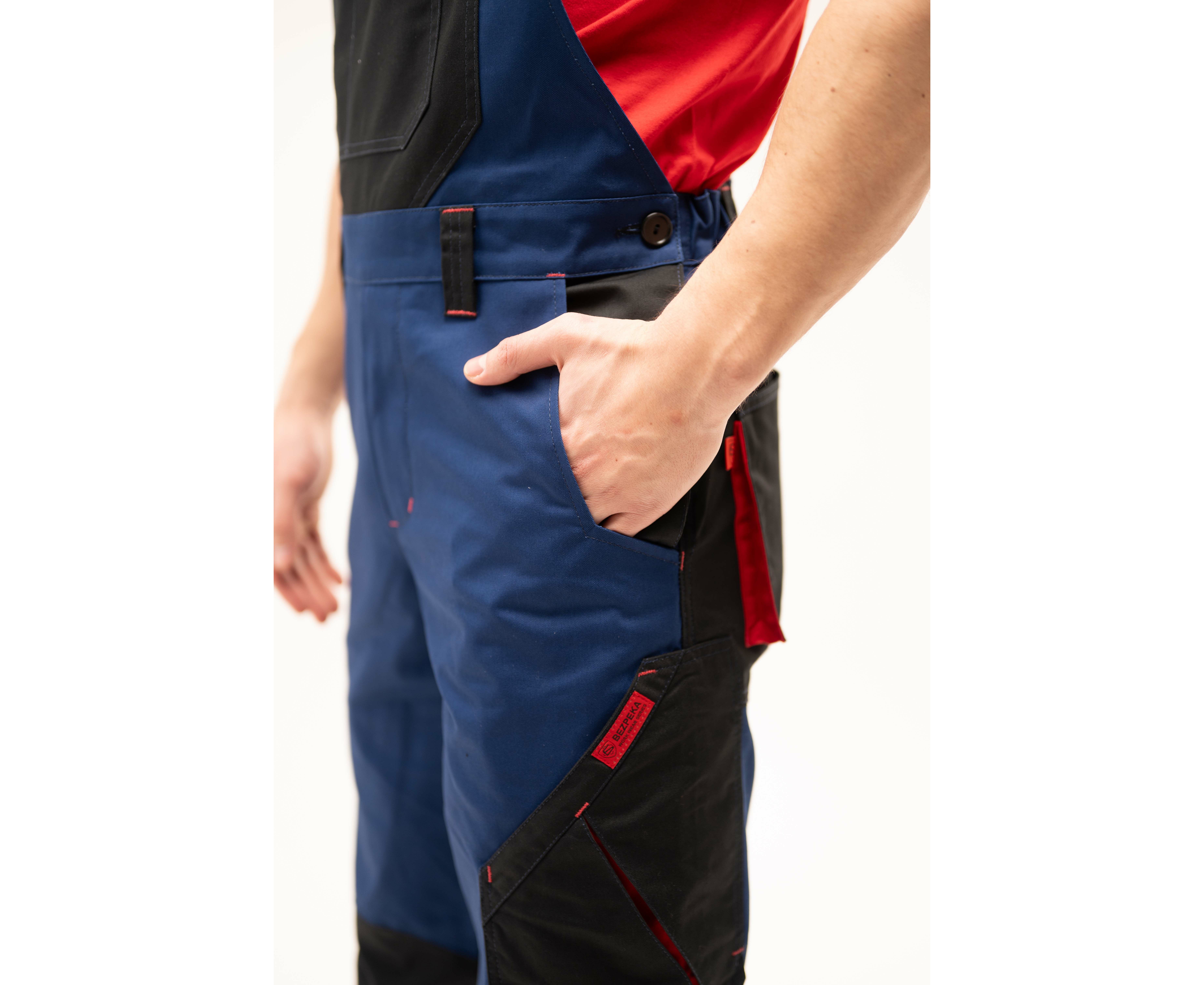 Напівкомбінезон чоловічий із комбінованої саржі з оздобленням у чорно-червоній кольоровій гамі, з високим нагрудником та бічними застібками на гудзики. Бретели з еластичною тасьмою на карабінах, гульфік на блискавці.
