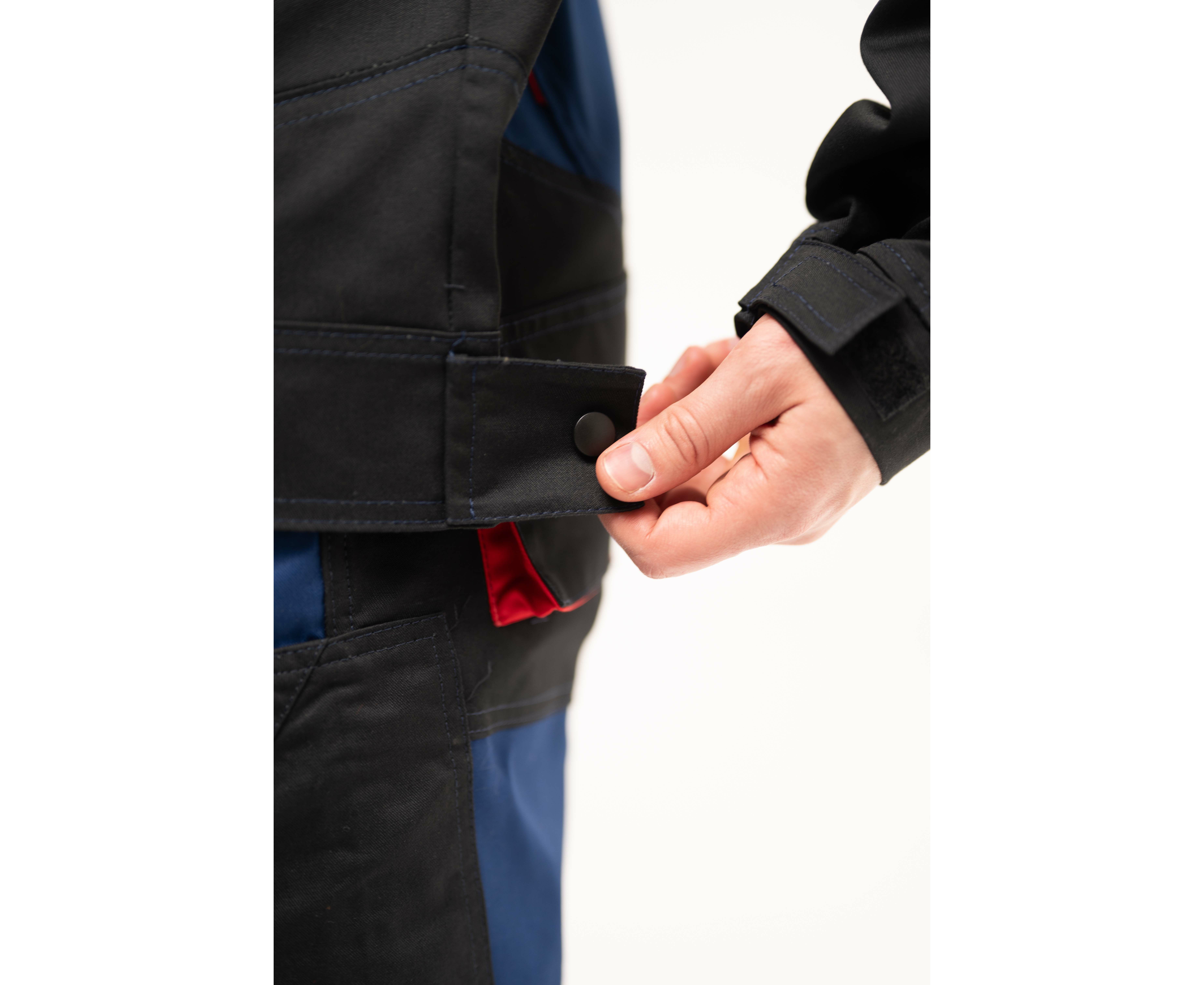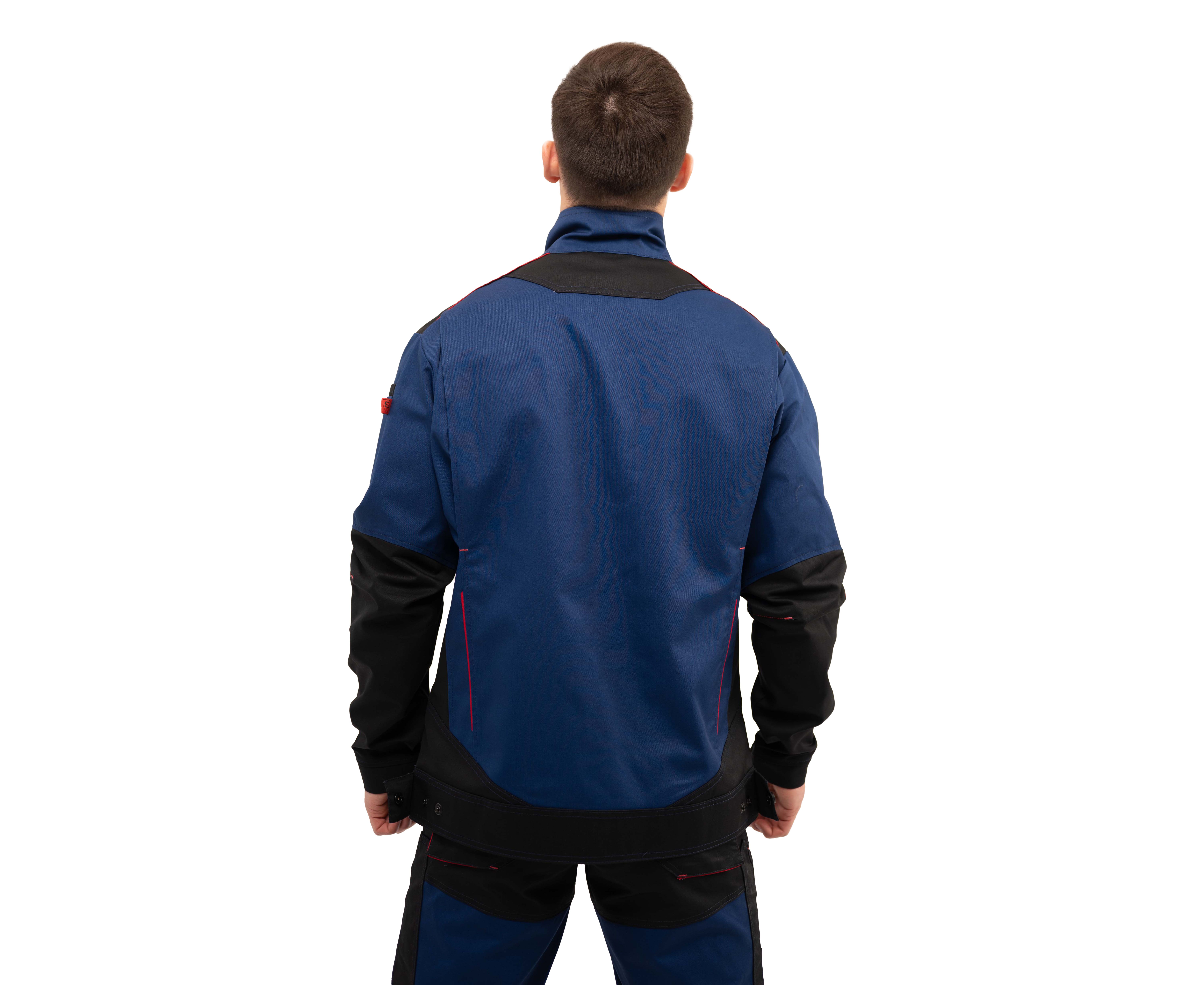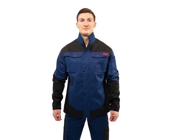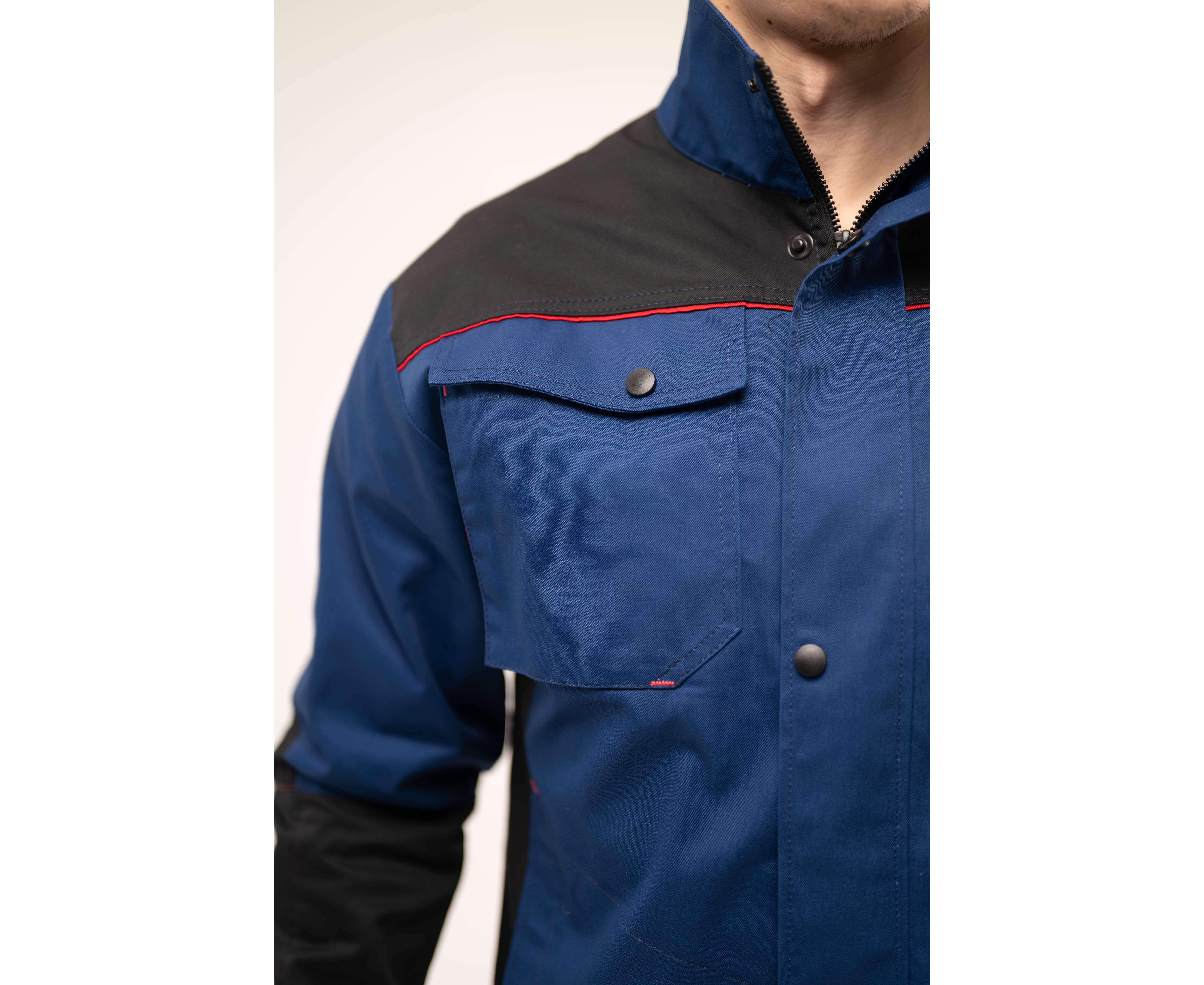 Куртка мужская рабочая Premium new 2 Navy прямого силуэта из комбинированной саржи с отделкой в черно-красной цветовой гамме с центральной застежкой на тесьму «молния», которая закрывается защитной планкой на кнопках.