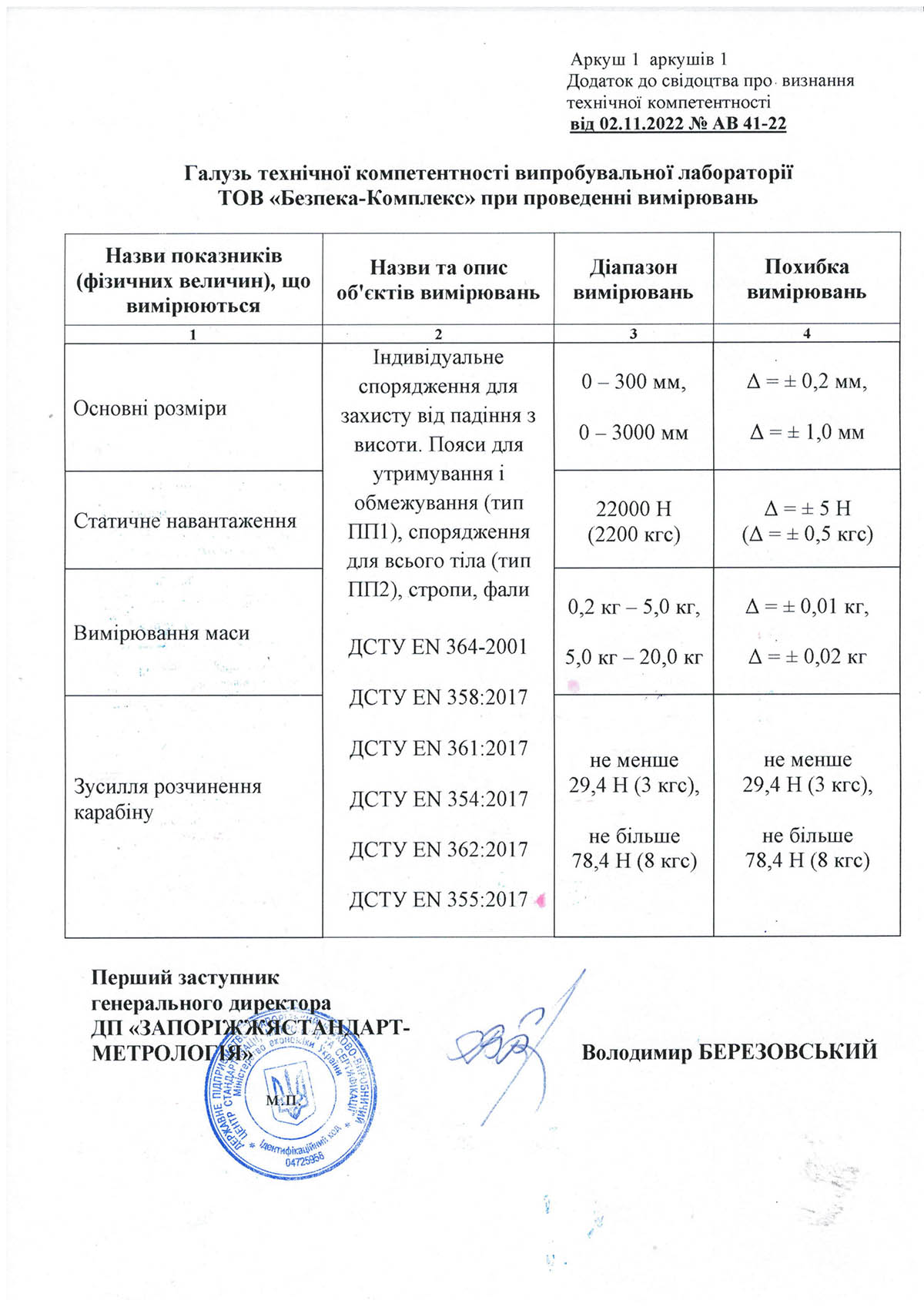 А также лаборатория проводит испытания страховочных предохранительных поясов / систем / строп на статическую нагрузку до 22кН, согласно области технической компетенции лаборатории. Испытания предохранительных поясов проводятся в соответствии с требованиями национальных стандартов Украины, гармонизированных с международными и европейскими. Результаты периодических и технических испытаний фиксируются протоколом.