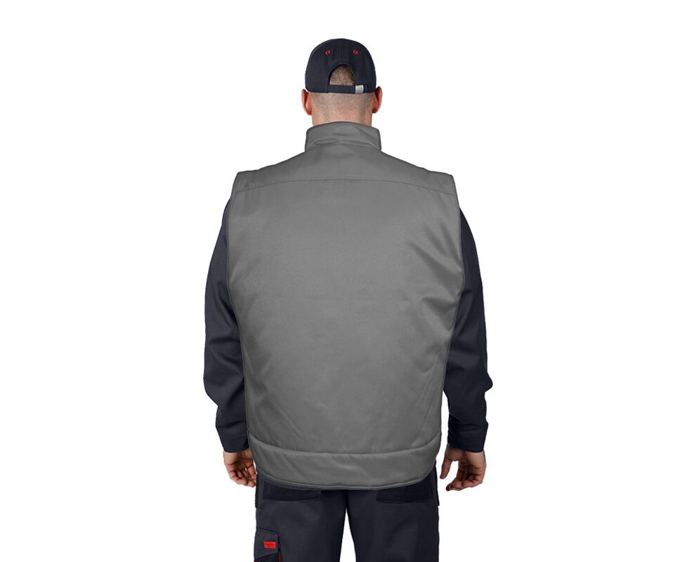 Мужской жилет рабочий утепленный Standart Grey на утепляющей подкладке с отделкой в красном или оранжевом цвете. Застежка - центральная на тесьму - «молния». Воротник – стойка.